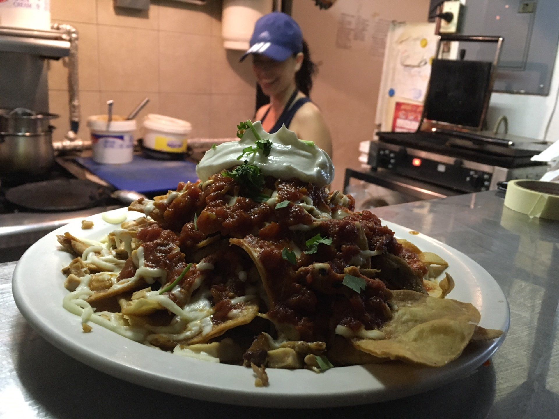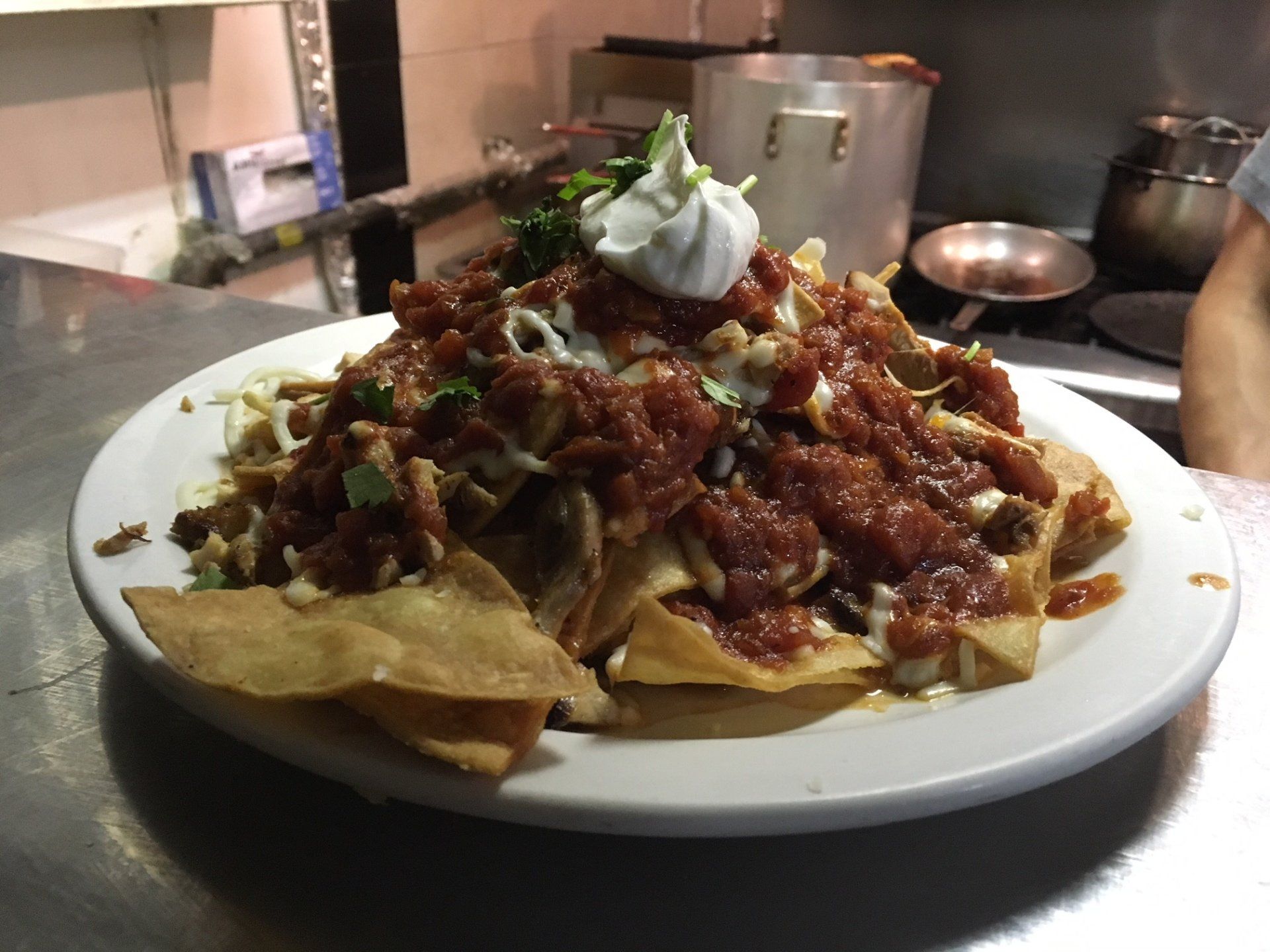 Authentic nachos served with tomato salsa, melted cheese, a dollop of sour cream and fresh