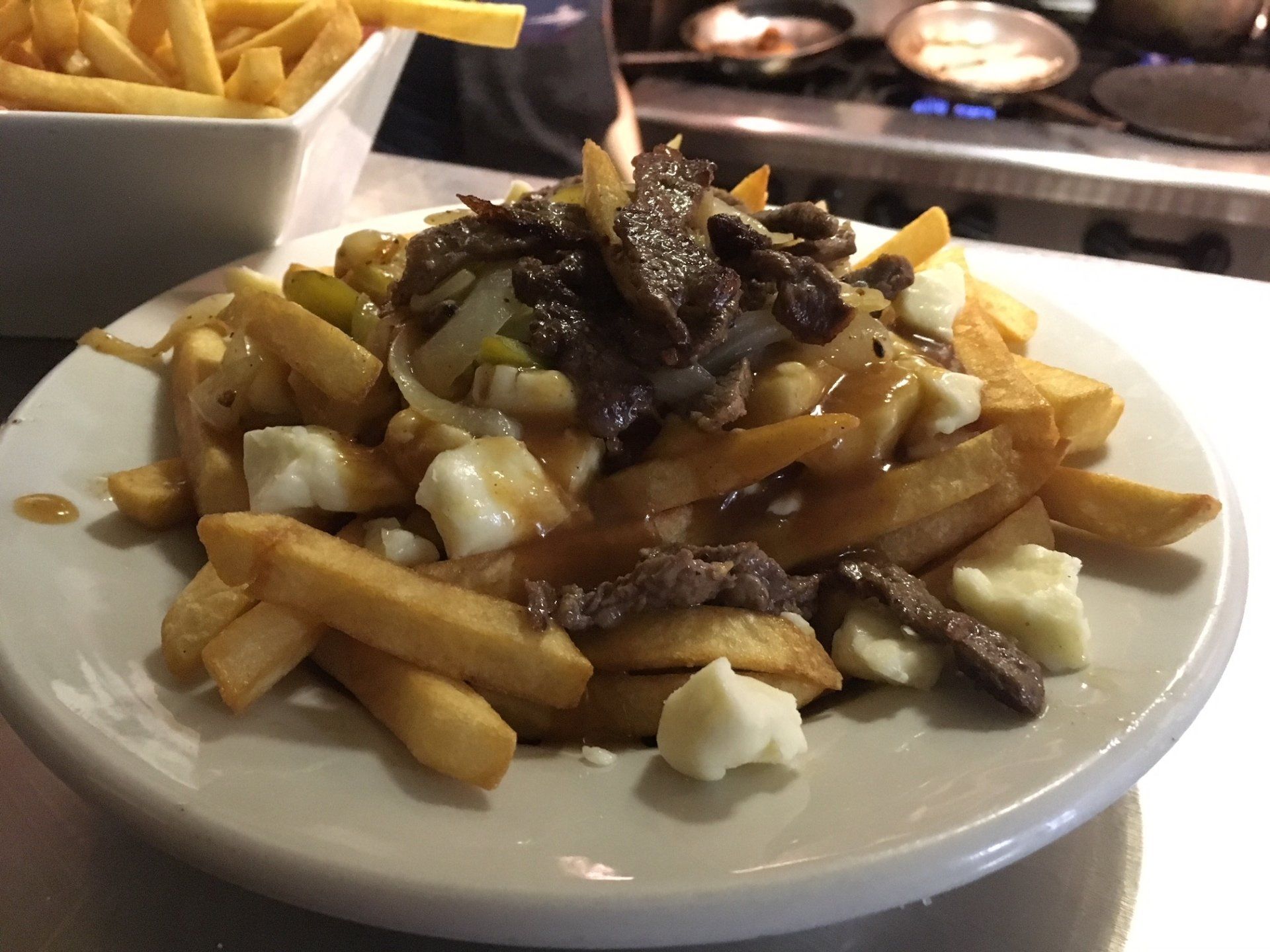 Lanières de boeuf sautées avec oignons et piments verts, garnies de fromage fondu. Beef strips sautéed with onions and green peppers, topped with melted cheese.